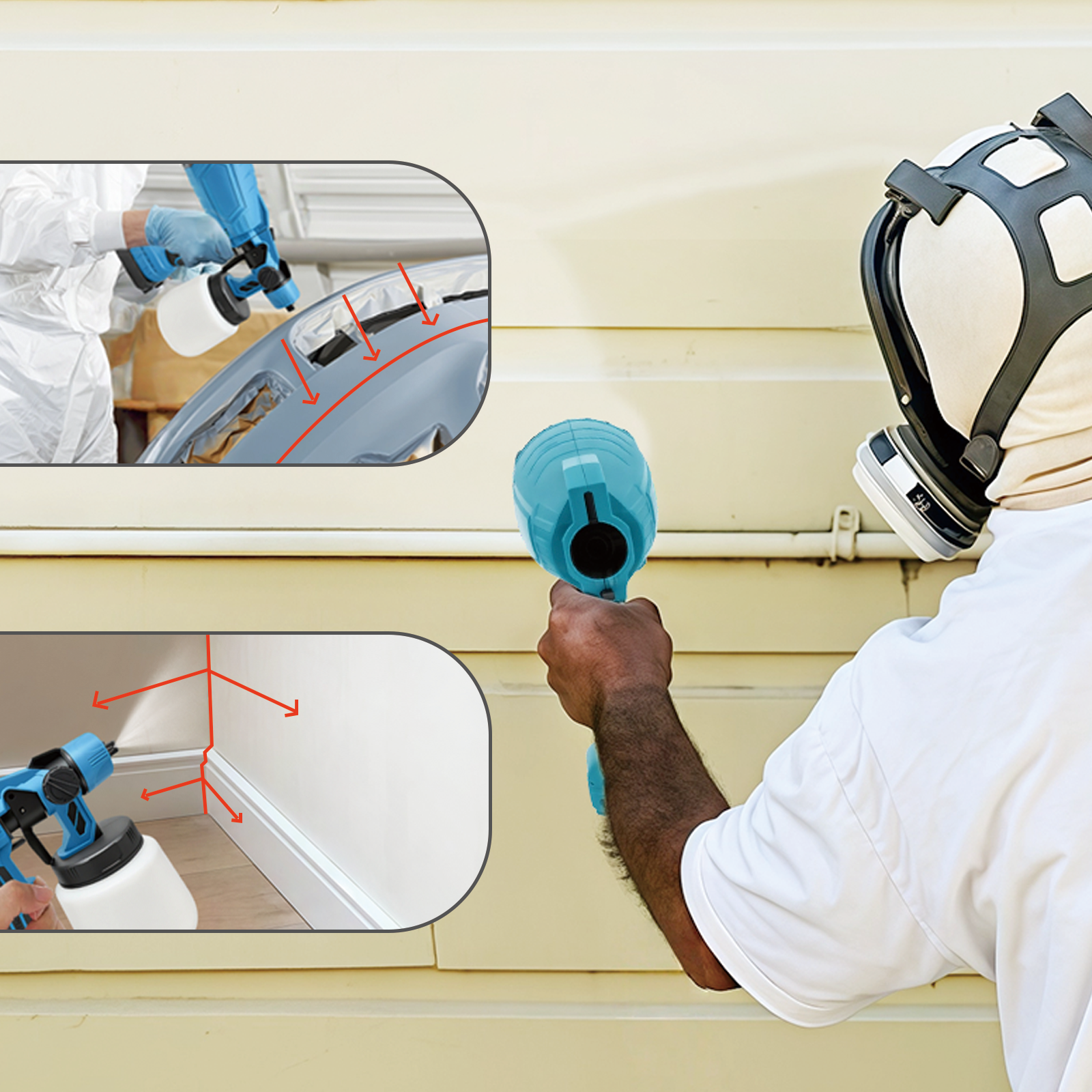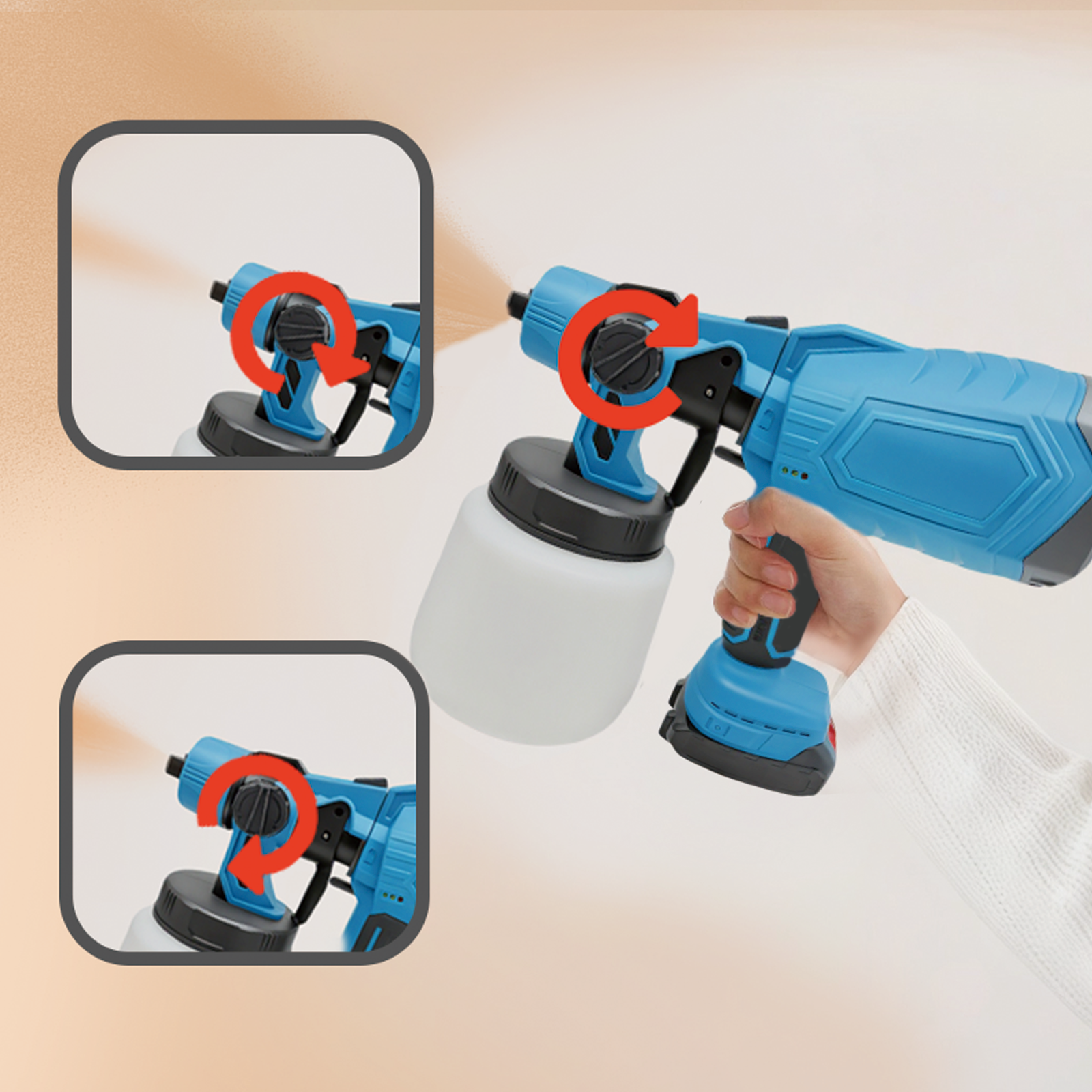 Con un simple giro, puedes cambiar fácilmente entre tres patrones de pulverización diferentes: horizontal, vertical y circular. Esto permite un control preciso tanto si estás pintando rápidamente una pared grande como si trabajas en áreas estrechas como marcos de puertas y muebles, ayudándote a conseguir el acabado perfecto.