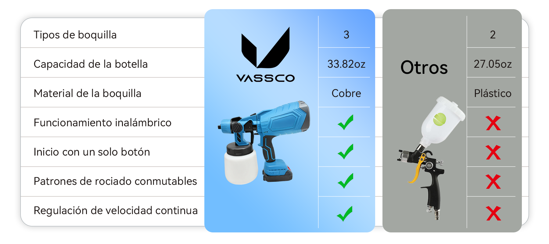 Cuando se trata de superficies irregulares o complejas, el diseño flexible y único del Vassco te permite pulverizar con estabilidad desde cualquier ángulo. Ya sean curvas, bordes o espacios interiores difíciles de alcanzar, puedes lograr una cobertura precisa con facilidad, haciendo que incluso las tareas más desafiantes sean sencillas.