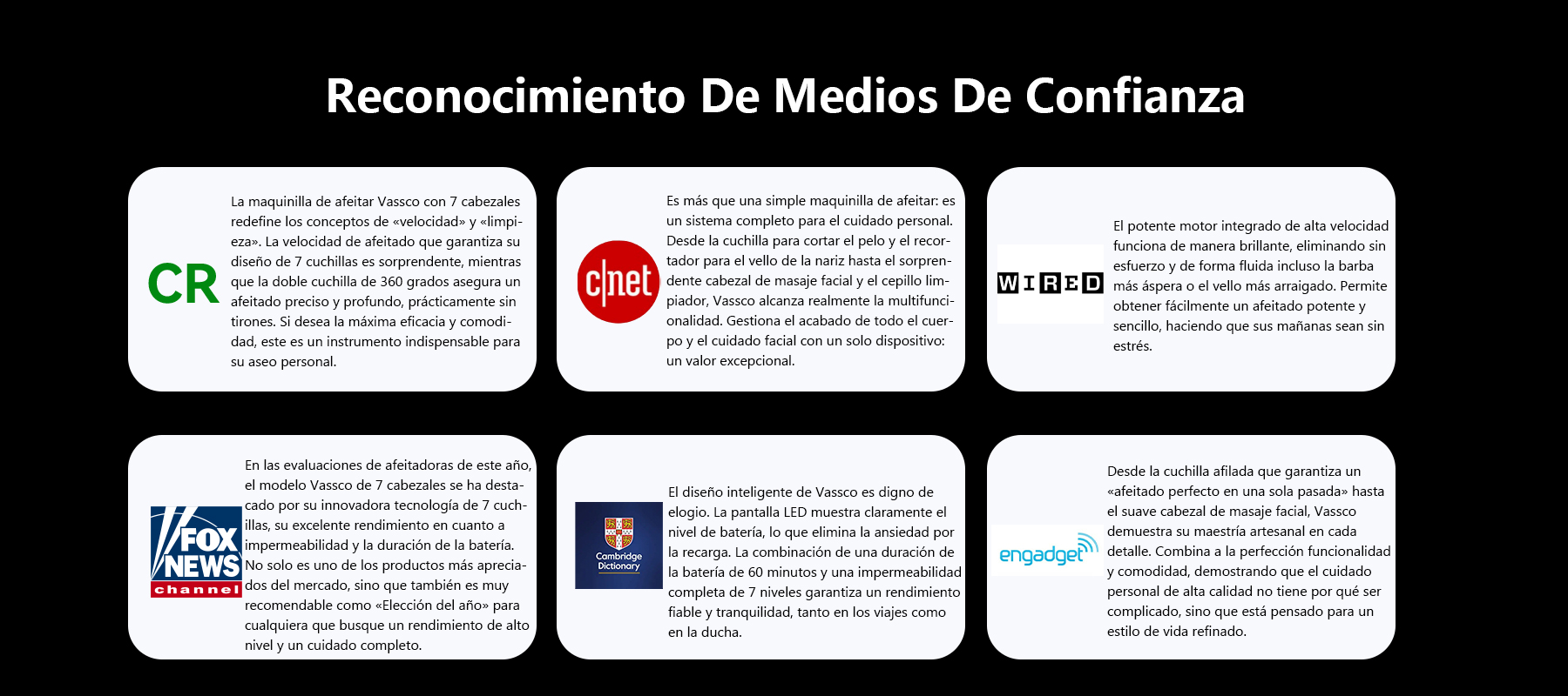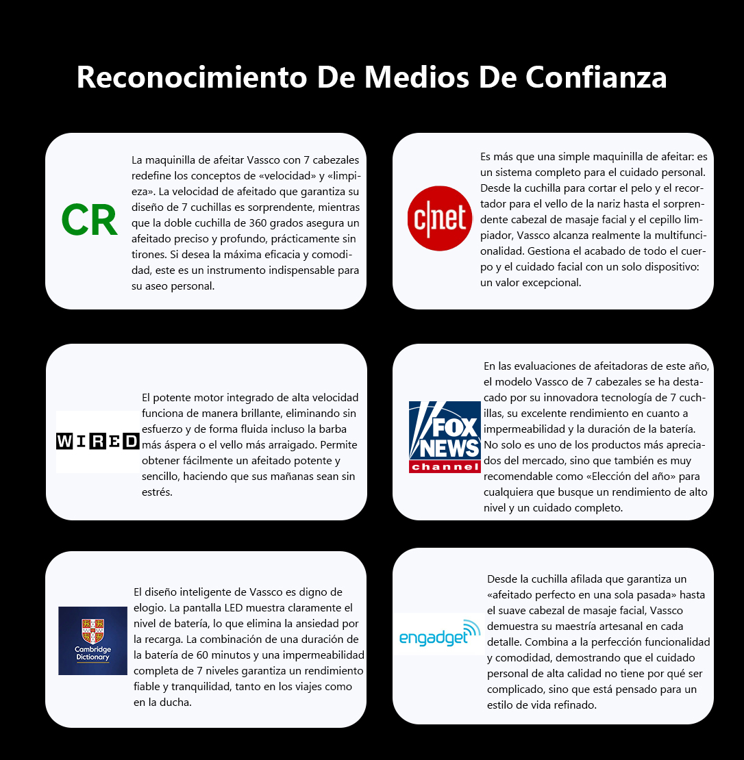 Vassco utiliza la innovadora Tecnología Flotante de 7 Cabezales y 360° para abrazar de forma flexible cada sutil curva y contorno de la mandíbula, el cuello y la cabeza. Captura el vello desde todas las direcciones, eliminando los puntos ciegos comunes en las afeitadoras tradicionales y garantizando un resultado completo y suave en todo momento.